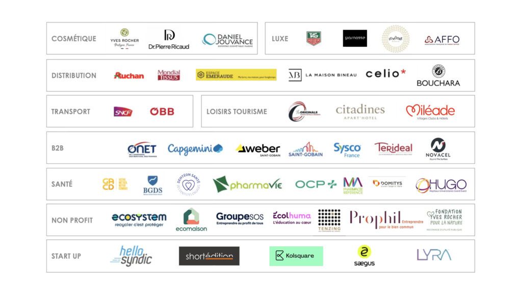 - Yves Rocher, Espace Emeraude, Auchan, Lenôtre, Eco-systèmes, Eco-mobilier, The Originals, groupe Brake, H&M, Sncf, Weber/Saint-Gobain, Mondial Tissus, Orange, adidas, Danone, Groupe SOS, Parcours, TAG Heuer…