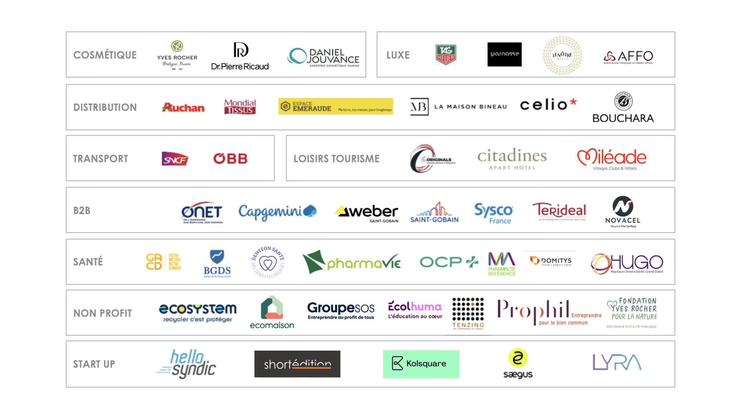 - Onet, Auchan, Mondial Tissus, Lenôtre, Picard, Espace Emeraude, Eco-emballages, The Originals, groupe Brake, Weber/Saint-Gobain, Accor, Pharmavie, Galeries Lafayette, groupe GACD, Groupe SOS…